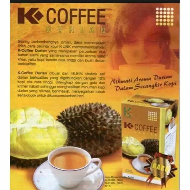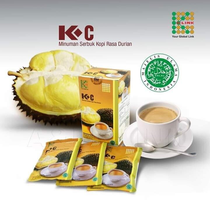 K-C / K-Coffee Durian / Kopi Minuman Serbuk Kopi Rasa Durian Minuman kesehatan dengan kombinasi unik dari “the king of fruit” yaitu buah durian dengan kenikmatan cita rasa kopi yang khas, menjadikan K-C minuman yang nikmat, bergizi sekaligus menyegarkan untuk dikonsumsi sehari-hari